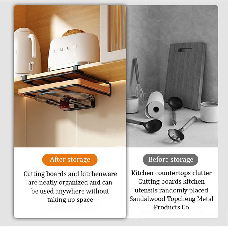 SPACE-SAVING DESIGN: This under-cabinet storage rack maximizes your kitchen space by utilizing unused areas. Its compact design allows you to neatly organize pot lids, cutting boards, and other kitchen essentials, freeing up valuable counter and cabinet space for a tidier, more functional kitchen environment.