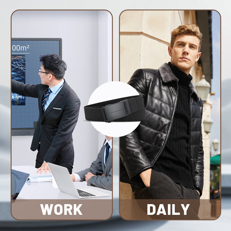 AUTOMATIC BUCKLE HEAD – The belt features a modern automatic buckle that eliminates the need for fixed holes. The buckle pin can be inserted at any point along the belt, allowing you to freely adjust the waist circumference for maximum comfort. Enjoy a perfect fit every time!