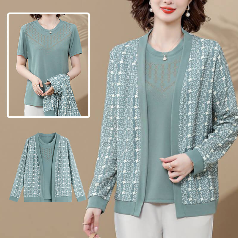 Mother two-piece female suits are women's suits made up of a matching round-neck T-shirt and an coat. The suits are designed to create a stylish and professional look suitable for various occasions, such as walks, shopping, and parties.